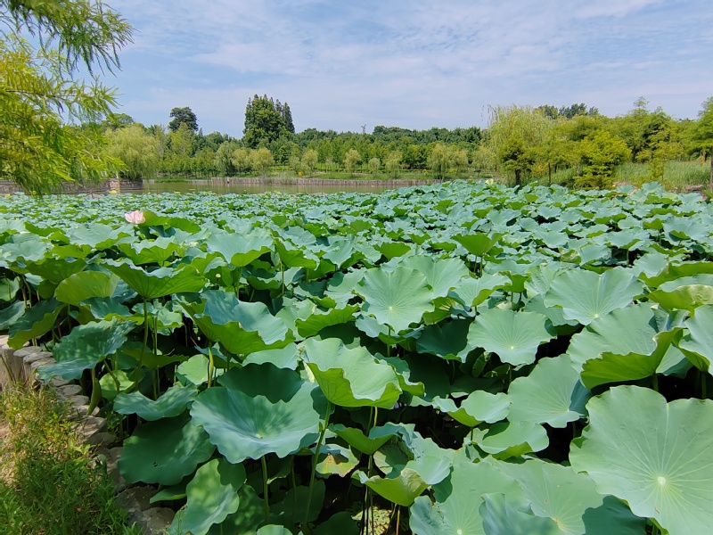 隨著氣溫持續(xù)升高,公園內的荷花競相開放,荷葉碧翠欲滴,展現了一副接天蓮葉無窮碧,映日荷花別樣紅的魅力畫卷,讓人感受到一絲絲涼意。周邊居民陳先生說:“有了荷花,這里的夏天更加漂亮了”。湖邊是垂柳依依,隨風浮動。荷葉一個接著一個鋪了滿塘,有的盛著晶瑩剔透的水珠,不禁想起小時候不懂事,會把荷葉折下來,拿在手中轉圈圈。