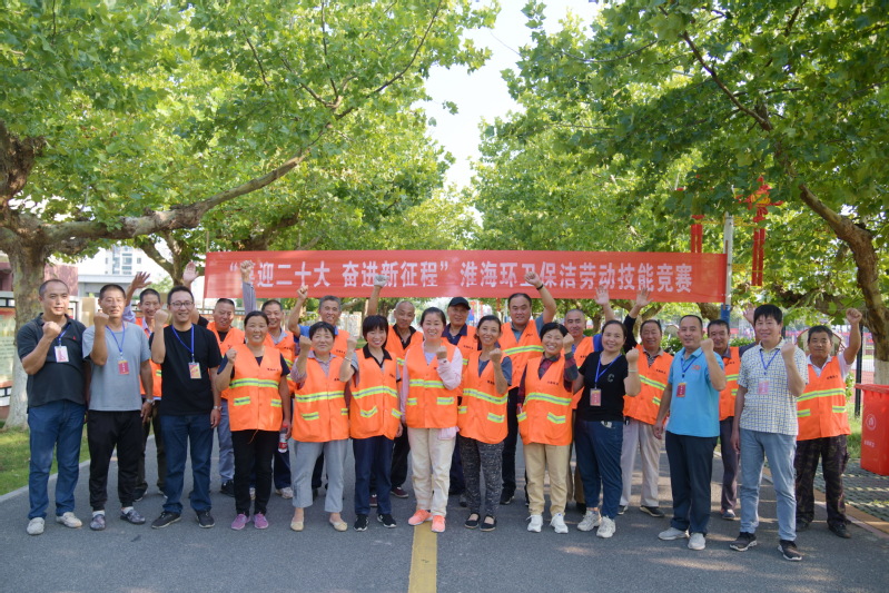 淮海農(nóng)場(chǎng)社區(qū)綠化環(huán)衛(wèi)所的環(huán)衛(wèi)職工,他們用辛勤的汗水和勤勞的雙手,守護(hù)著美麗淮海的“顏值”。環(huán)衛(wèi)人員也以他們兢兢業(yè)業(yè)的勞動(dòng)成果,贏得了農(nóng)場(chǎng)職工居民的廣泛贊譽(yù)和尊重。圖為結(jié)束比賽的環(huán)衛(wèi)職工和裁判人員開心地在標(biāo)語橫幅下合影留念。