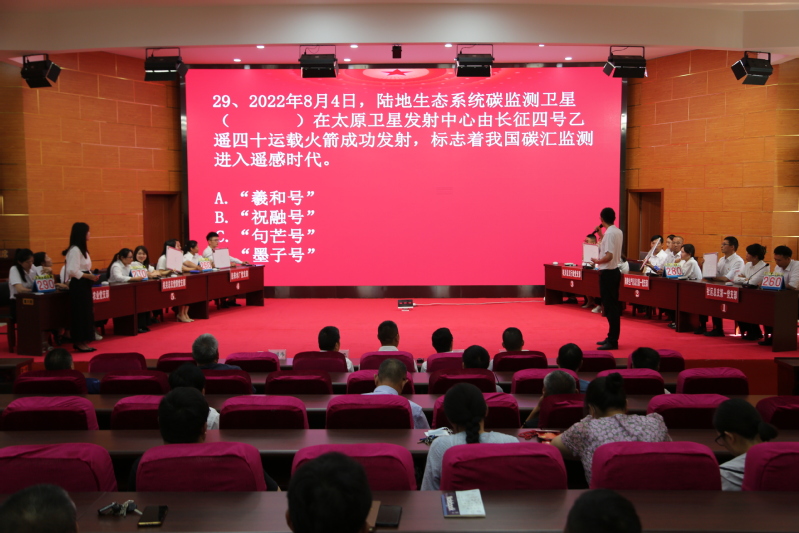 本次比賽分為兩個階段進行,在6月25日的預賽中,全場18支代表隊進行了筆試考核,通過每隊總比分,選出了今天6支參加決賽的隊伍。在主持人的宣布下,比賽正式拉開帷幕?!罢埪狀},黨的二十大報告指出……請開始搶答?!薄罢?號臺答題,三號臺搶答犯規(guī)……”在現(xiàn)場,6支代表隊“八仙過海各顯神通”,大家“邊賽邊學”、“以賽促學”,在必答題、搶答題和風險題3個環(huán)節(jié)上充分發(fā)揮團隊力量,傾力配合。各支代表隊你追我趕,互不相讓,臺下觀眾也聚精會神,對著屏幕學習黨的二十大知識,現(xiàn)場不時發(fā)出熱烈的掌聲。在每個環(huán)節(jié)休息階段,大會還組織開展了現(xiàn)場互動答題,并準備了精美禮品?,F(xiàn)場觀眾紛紛踴躍搶答,再度將本次競賽活動氣氛推向了頂峰。