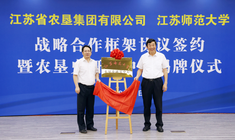 8月10日上午,集團(tuán)公司與江蘇師范大學(xué)戰(zhàn)略合作框架協(xié)議簽約暨農(nóng)墾史研究中心揭牌儀式在徐州舉行。集團(tuán)公司黨委書記、董事長(zhǎng)魏紅軍,江蘇師范大學(xué)黨委書記方忠出席并致辭。集團(tuán)公司黨委副書記、總經(jīng)理胡兆輝與江蘇師范大學(xué)黨委副書記、校長(zhǎng)周汝光共同為江蘇師范大學(xué)農(nóng)墾史研究中心揭牌。集團(tuán)公司黨委副書記姚準(zhǔn)明與江蘇師范大學(xué)黨委常委、副校長(zhǎng)蔡國(guó)春共同簽署《戰(zhàn)略合作框架協(xié)議》。江蘇師范大學(xué)農(nóng)墾史研究中心主任岑紅發(fā)言。集團(tuán)公司黨委委員、總會(huì)計(jì)師劉克英,黨委委員、紀(jì)委書記李旭東,副總經(jīng)理劉耀武,黨委委員、副總經(jīng)理王立新,黨委委員、工會(huì)主席楊義林,江蘇師范大學(xué)黨委常委、黨委宣傳部部長(zhǎng)孟召學(xué),黨委常委、黨委統(tǒng)戰(zhàn)部部長(zhǎng)、黨委辦公室主任商亮出席。
