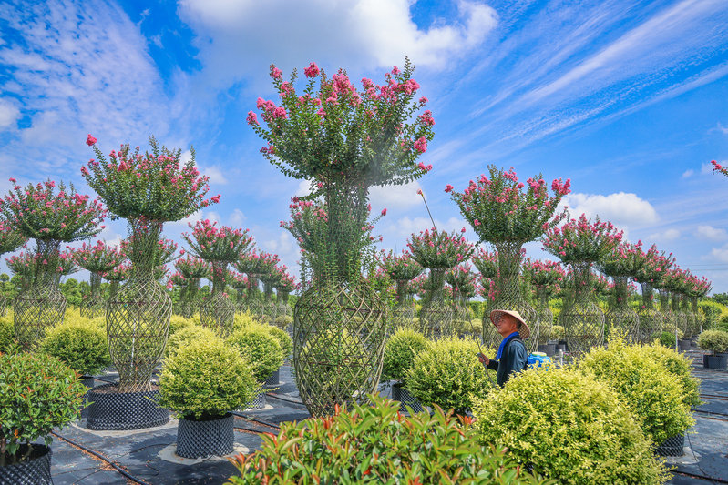 8月14日,在江蘇省鹽城市射陽縣,江蘇農墾新洋農場容器苗項目基地,管理人員正在養(yǎng)護紫薇花瓶。近年來,新洋農場利用容器苗基地優(yōu)勢,在栽培方式上大膽嘗試,通過扦插培育,實現了自繁自育栽培技術的新突破,容器栽培的模式使苗圃成活率更高、綠化效果更好,優(yōu)良的品質廣受全國各地綠化項目方的青睞。