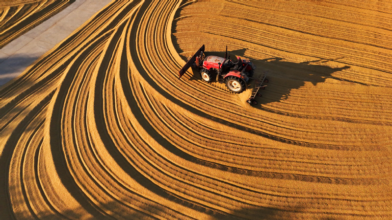 江蘇省連云港市海州區(qū)云臺(tái)農(nóng)場(chǎng)工作人員搶抓晴好天氣翻曬稻谷(10月28日攝,無人機(jī)照片)?!靶轮?chǎng)泥鏡面平,家家打稻趁霜晴。”金秋時(shí)節(jié),各地迎來豐收季,農(nóng)民抓住晴好天氣收割收獲晾曬谷類作物,田間地頭呈現(xiàn)一派忙碌的豐收景象。新華社發(fā) 耿玉和 攝