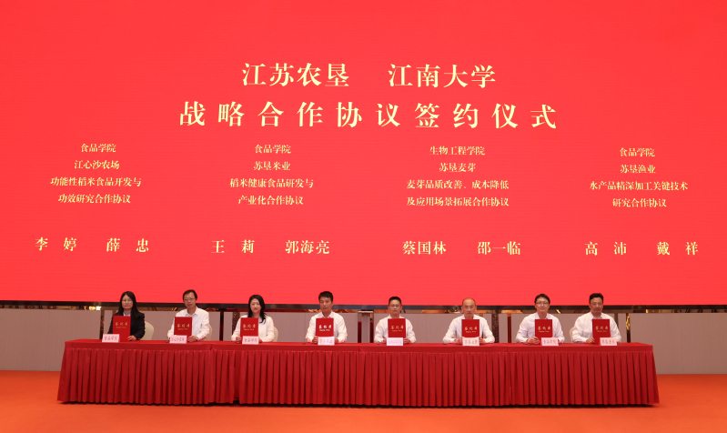 集團公司總經(jīng)濟師、相關部門負責人,江心沙農(nóng)場、蘇墾農(nóng)發(fā)、蘇墾漁業(yè)等單位負責人,江南大學相關學院及部門負責人、專家教授等參加簽約儀式。