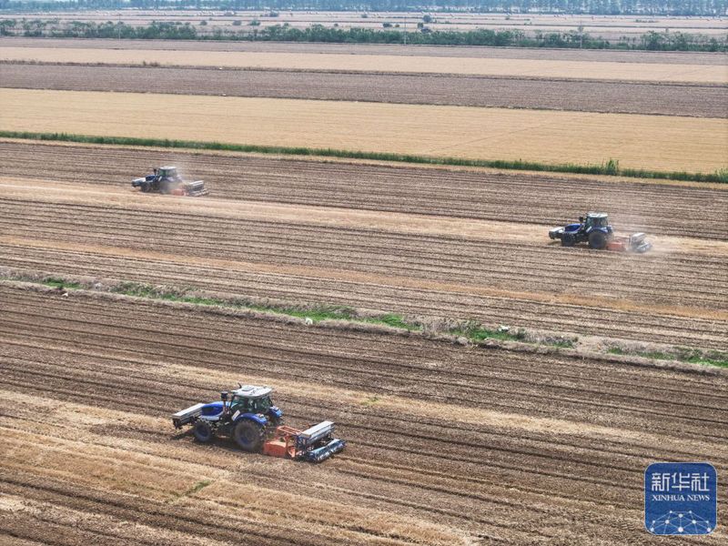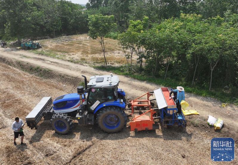 5月28日,揚(yáng)州大學(xué)研制的“九合一”稻麥耕播機(jī)在三河農(nóng)場播稻種(無人機(jī)照片)。新華社記者 季春鵬 攝