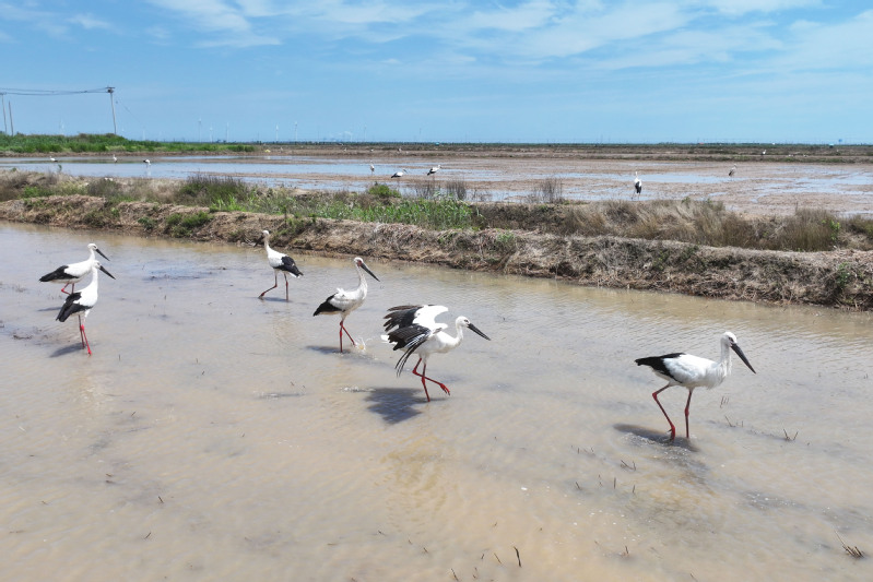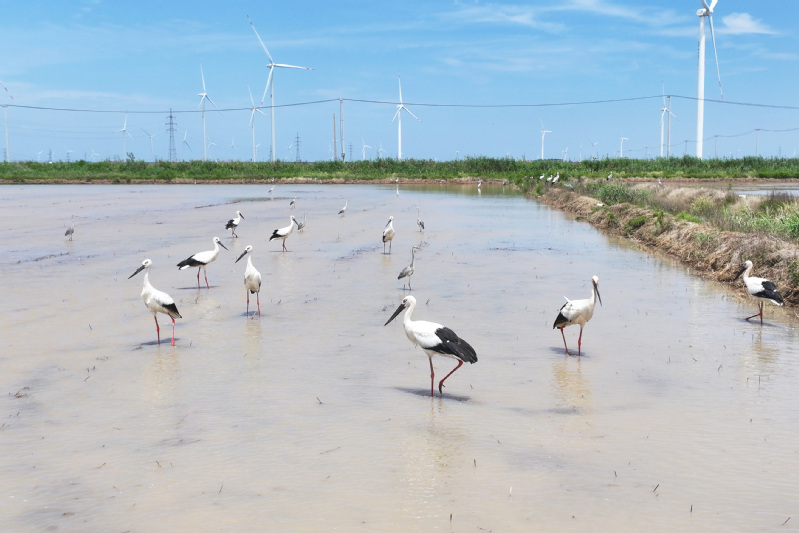 6月23日,江蘇省鹽城市射陽縣臨海農場順泰生產區(qū)的水田里,50余只國家一級保護動物東方白鸛姿態(tài)優(yōu)雅,正悠然漫步、覓食,與水田的碧波相互映襯,構成一幅靈動的生態(tài)畫卷。