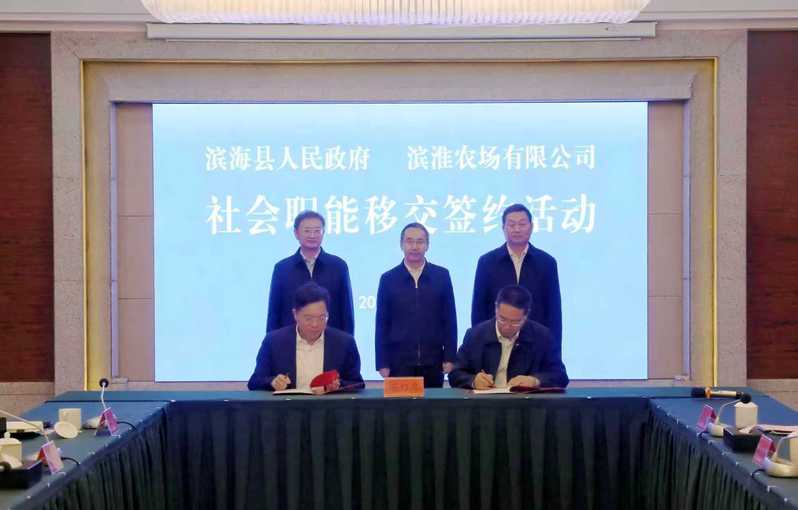 簽約儀式上,濱淮農(nóng)場(chǎng)與濱??h人民政府簽訂了社會(huì)職能移交協(xié)議。集團(tuán)公司辦公室、濱淮農(nóng)場(chǎng)、濱??h相關(guān)部門(mén)負(fù)責(zé)人參加活動(dòng)。