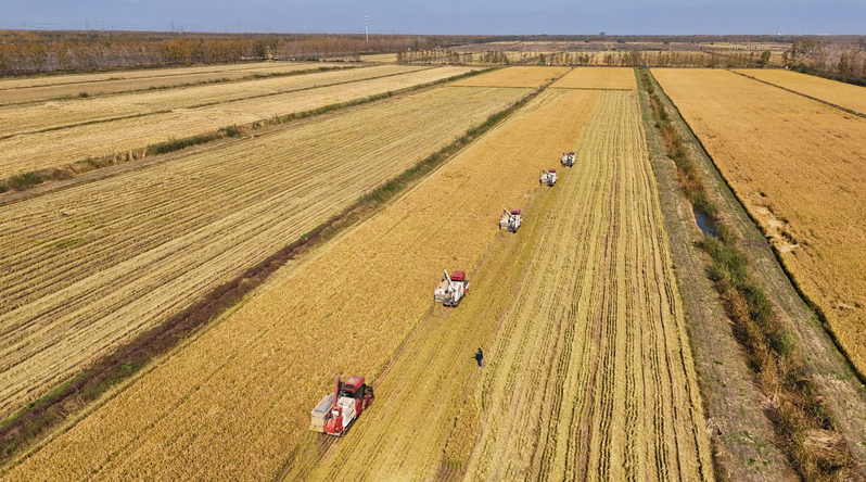 11月5日,連云港市海州區(qū),江蘇農(nóng)墾崗埠農(nóng)場的高標準農(nóng)田里,職工駕駛收割機來回穿梭,開展水稻搶收工作。連日來,當(dāng)?shù)胤e極組織人員、機械,搶抓農(nóng)時做好水稻收割工作,爭取盡快完成秋收,確保顆粒歸倉。徐衛(wèi) 方冉冉 攝