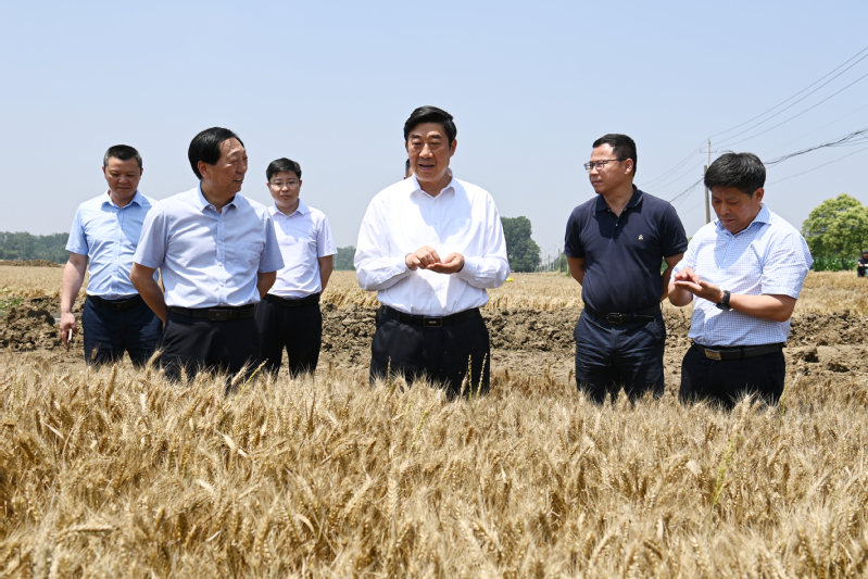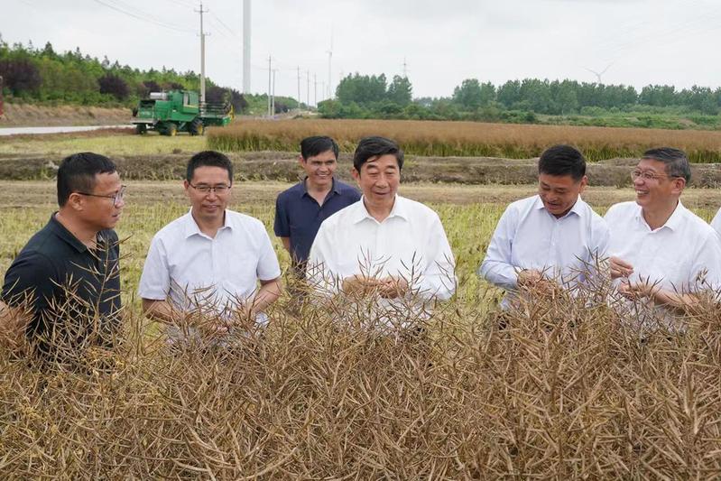 6月1日下午,集團公司黨委副書記、總經理胡兆輝到新曹調研指導“三夏”工作和農場公司產業(yè)發(fā)展。胡兆輝先后察看了蘇墾農發(fā)新曹分公司油菜收割現場、小麥收割現場、水稻秧池、耕整打作現場、糧食烘干線和晾曬場、高標準農田建設項目區(qū),以及農場公司原絲綢廠廠房、日本矮麥冬套種基地,認真聽取有關人員的情況介紹,與一線工作人員親切交談,詳細了解蘇墾農發(fā)新曹分公司“三夏”工作進展和農場公司產業(yè)發(fā)展情況,對新曹“同舉一面旗、共下一盤棋、全力戰(zhàn)三夏”的做法表示肯定,對新曹前段時間大力支持“淮海啤麥會戰(zhàn)”給予贊揚,對新曹一班人團結奮斗、激情創(chuàng)業(yè)的氛圍表示贊賞。他指出,今年“三夏”生產形勢十分嚴峻,新曹作為墾區(qū)大場之一,要牢記“國之大者”,強化責任擔當,全力做好“三夏”各項工作,為墾區(qū)“三夏”全勝作出更大貢獻。他要求,要強化防災抗災減災意識,圍繞“五不”和“五確?!蹦繕?,立足于搶,著眼于快,抓住當前晴好天氣,保種子、保原糧、保栽插進度,把豐收在望變成豐收到手,一著不讓同步打牢秋超增收基礎;要樹牢墾區(qū)一盤棋思想,針對可能出現的惡劣天氣,提前做好“南機北援”準備工作,全力支援兄弟單位“三夏”搶收搶種。他強調,開展主題教
