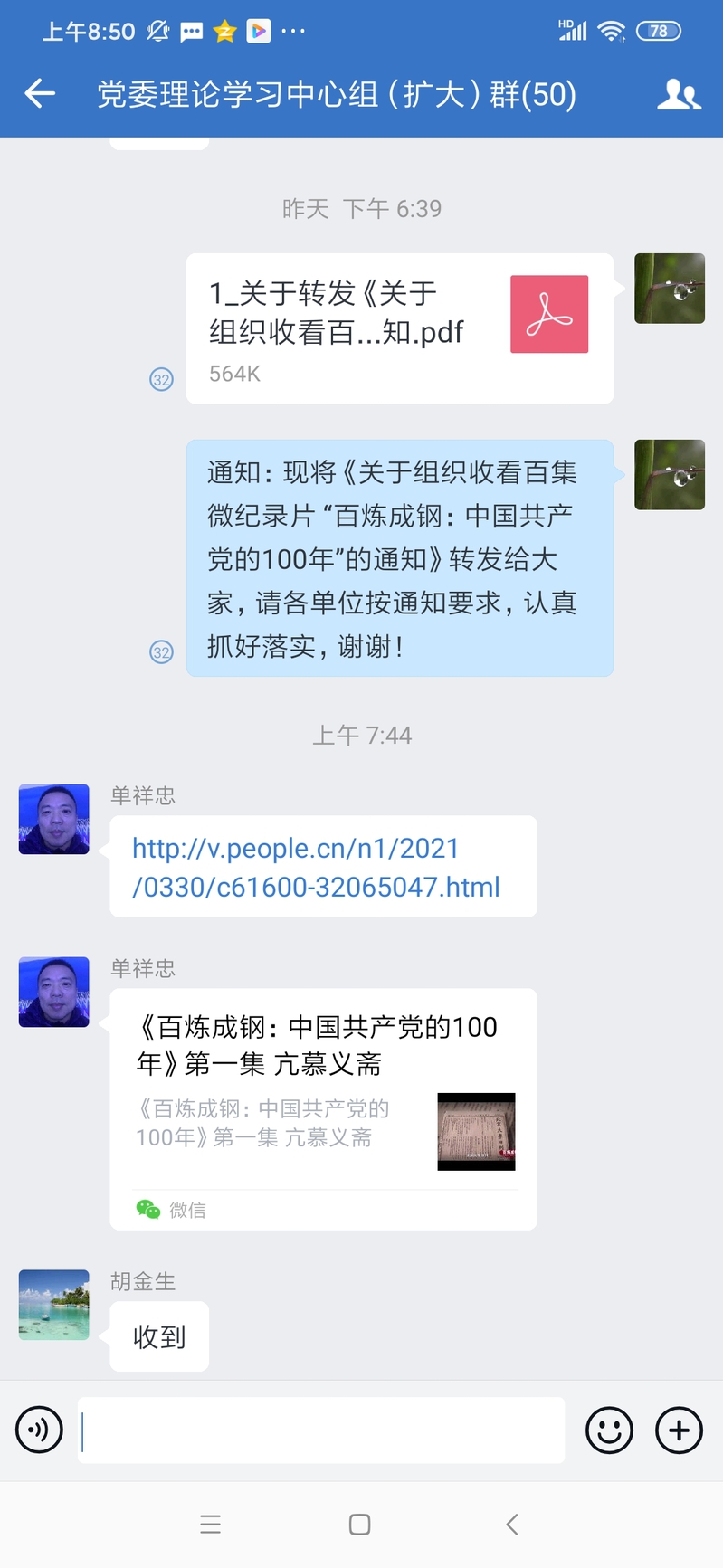 淮海農(nóng)場(chǎng)公司在昨天傍晚接到江蘇農(nóng)墾黨史學(xué)習(xí)教育第三組《關(guān)于組織收看百集微紀(jì)錄片百煉成鋼:中國(guó)共產(chǎn)黨的100年”的通知》后,立刻借助企業(yè)微信平臺(tái)黨委理論學(xué)習(xí)中心組(擴(kuò)大)群進(jìn)行轉(zhuǎn)發(fā)落實(shí),農(nóng)場(chǎng)黨委書記單祥忠在今天上午便將搜集來(lái)的《百煉成鋼:中國(guó)共產(chǎn)黨的100年》的紀(jì)錄片第1至第9集的視頻發(fā)布的學(xué)習(xí)群中,并以此來(lái)進(jìn)一步激發(fā)起廣大黨員干部職工學(xué)習(xí)黨史的熱情,在方便大家觀看學(xué)習(xí)中,不斷提升黨史的學(xué)習(xí)教育成效。