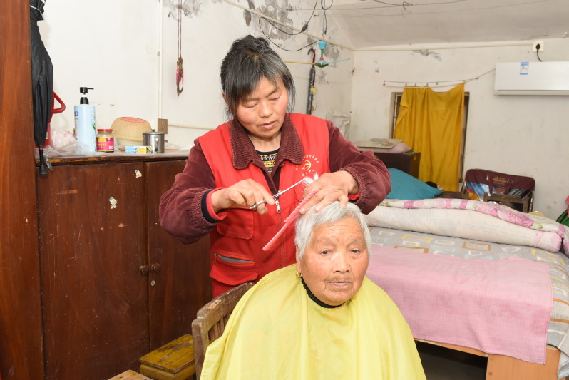 4月29日下午3時許,家住淮海農(nóng)場振興小區(qū)82歲的居民施維琴老人感覺十分清爽,因?yàn)榛春^r(nóng)場居家養(yǎng)老志愿服務(wù)人員張榮芳,對她的頭發(fā)好好地修剪了一番。