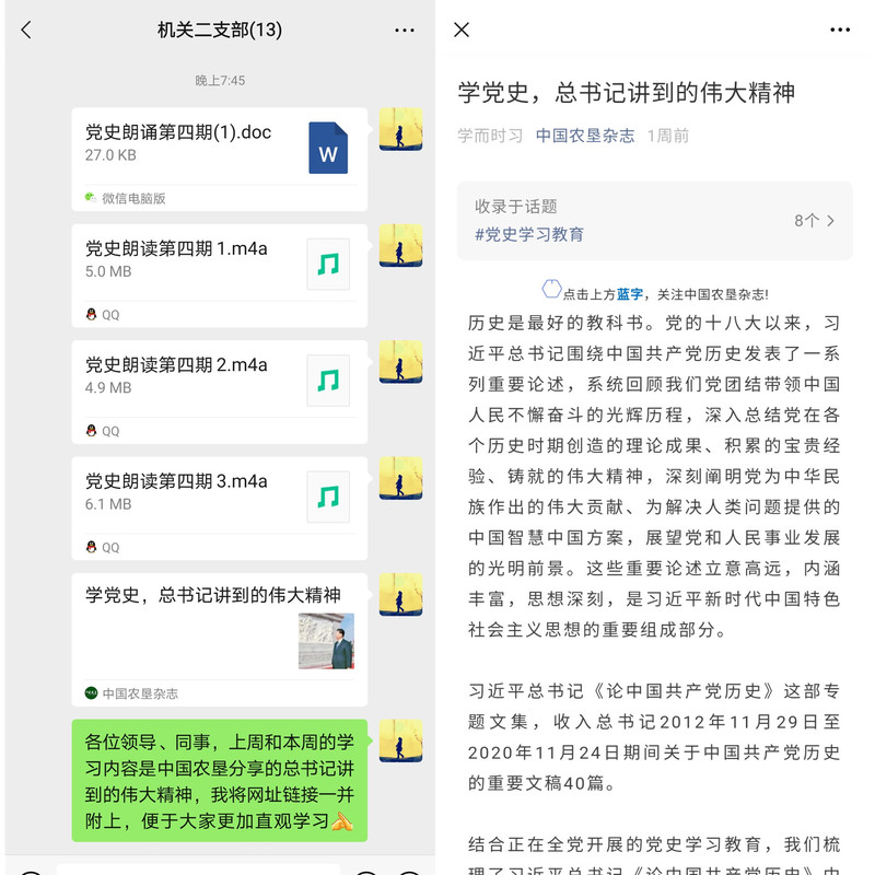 “各位領(lǐng)導(dǎo)、同事,上周和本周的學(xué)習(xí)內(nèi)容是中國農(nóng)墾分享的《總書記講到的偉大精神》,我將網(wǎng)址鏈接一并附上,便于大家更加直觀學(xué)習(xí)?!?月23日晚,新洋農(nóng)場(chǎng)有限公司機(jī)關(guān)二支部黨建助理員在支部微信群里分享了支部黨史朗讀第四期,這是該支部創(chuàng)新黨史學(xué)習(xí)方式的一個(gè)舉措。