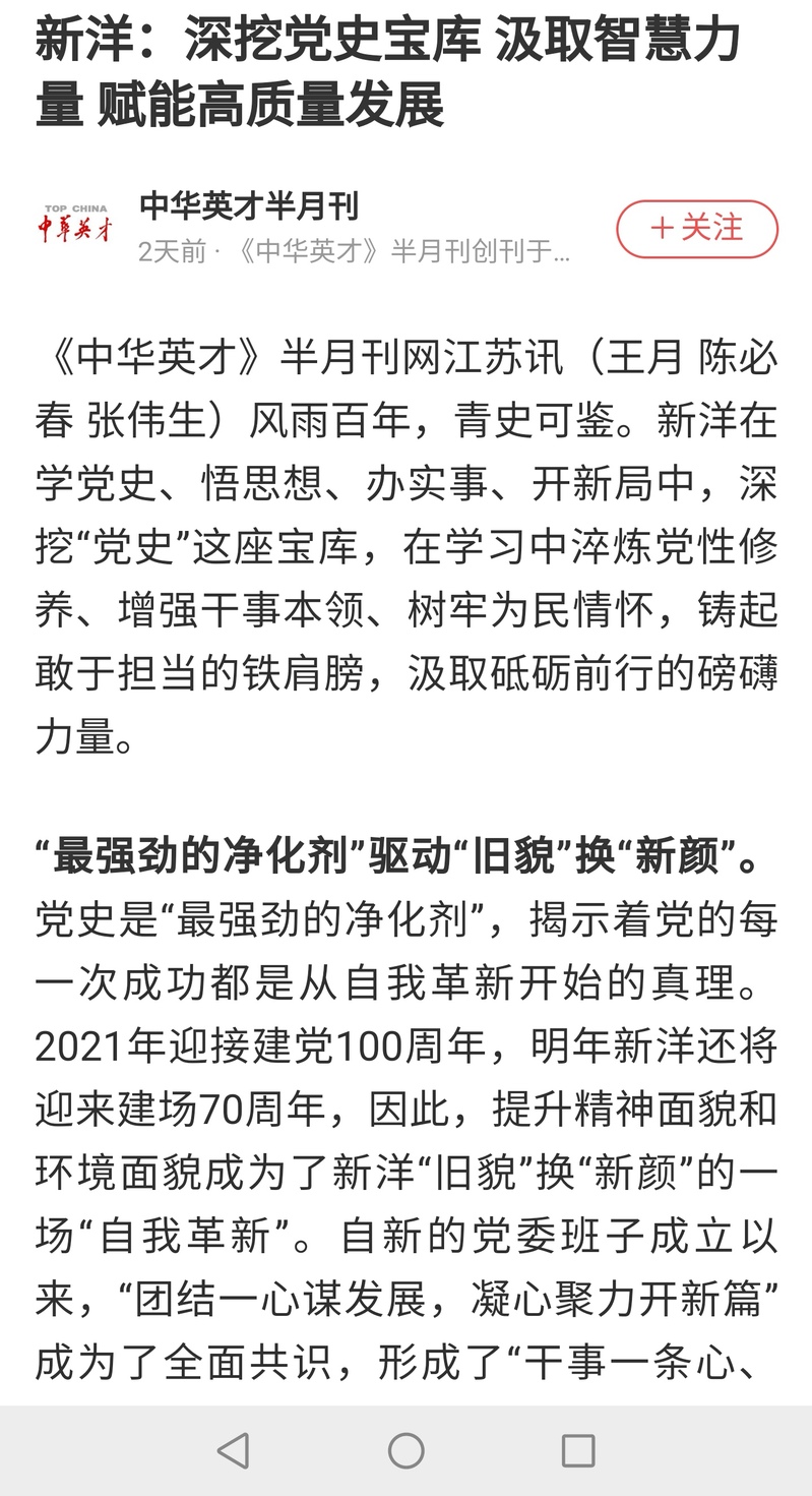 日前,新洋《深挖“黨史”寶庫 汲取智慧力量 賦能高質(zhì)量發(fā)展》一文登上《中華英才》網(wǎng),文章圍繞新洋從黨史學(xué)習(xí)教育中汲取智慧力量,在經(jīng)濟發(fā)展、環(huán)境提升、為民辦實事等方方面面煥發(fā)新活力、展現(xiàn)擔(dān)當(dāng)作為、賦能高質(zhì)量發(fā)展。