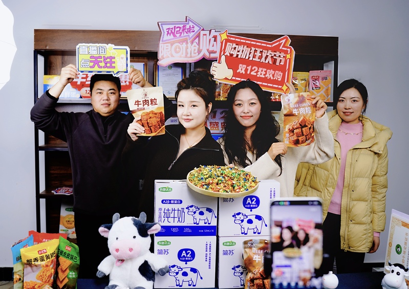 12月12日,蘇墾乳業(yè)巧妙打出“乳制品+肉制零食”營(yíng)銷(xiāo)組合拳,以A2β-酪蛋白原生高鈣純牛奶搭配新品牛肉粒超值組合為核心產(chǎn)品,實(shí)現(xiàn)4小時(shí)直播近萬(wàn)人圍觀、點(diǎn)贊破11萬(wàn)、銷(xiāo)售額破10萬(wàn)的亮眼成績(jī)。圖為蘇墾乳業(yè)青年直播團(tuán)隊(duì)。