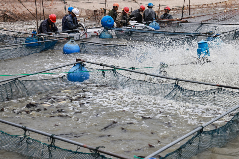 春放秋捕,共話豐收。走進(jìn)崗埠農(nóng)場(chǎng)公司南漁場(chǎng)的鯉魚養(yǎng)殖基地,一條條肥美的鯉魚不斷躍出水面,引起水花四濺。8月29日,崗埠農(nóng)場(chǎng)公司水產(chǎn)養(yǎng)殖中心迎來鯉魚“大豐收”,養(yǎng)殖基地內(nèi)熱鬧開捕秋天第一網(wǎng)鯉魚。初秋的早晨已然涼意十足,早上不到6點(diǎn),天剛蒙蒙亮,捕撈人員就來到魚塘開網(wǎng)起魚。在水產(chǎn)公司工作人員的指揮下,一張巨大的漁網(wǎng)隨著捕魚工人的移動(dòng)緩緩張開,大家不顧冰冷的水下溫度,緊張忙碌了起來。經(jīng)過鋪底、收網(wǎng)、聚攏等環(huán)節(jié)的共同協(xié)作,漁網(wǎng)被慢慢升起……整個(gè)現(xiàn)場(chǎng)一片繁忙熱鬧景象。經(jīng)過近三個(gè)小時(shí)的忙碌,在大家的精心分揀下,裝滿魚的筐子被吊車有序吊起,稱重、記錄、放魚一氣呵成?!斑@個(gè)吊車頂部的黃色圓塊就是電子秤,吊起魚的同時(shí),秤上的信號(hào)就發(fā)到這個(gè)無線接收裝置上來,秤重既方便又精準(zhǔn)?!爆F(xiàn)場(chǎng)記賬的方正解釋說?!翱催@些魚,品相好、質(zhì)量高,抓都抓不住,活蹦亂跳的,真是大豐收啊!”起魚的工人們雖然全身都已濕透,但是看著手里的大魚,臉上洋溢著收獲的笑容。據(jù)悉,本次捕撈的鯉魚名叫“福安鯉”,在春季投放,采取訂單式捕撈銷售。當(dāng)天,2.2萬斤“淮河牌”福安鯉被送上等候已久的運(yùn)輸車,銷往本省徐州市及河南省等地?!梆B(yǎng)殖中心依托豐富水