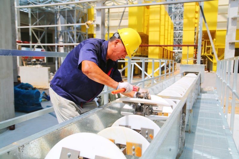 烈日炎炎,崗埠農(nóng)場一線建筑工人在1200噸糧食烘干線建設現(xiàn)場頂著高溫進行焊接、組裝等作業(yè),堅守崗位,全力保障項目如期完工。