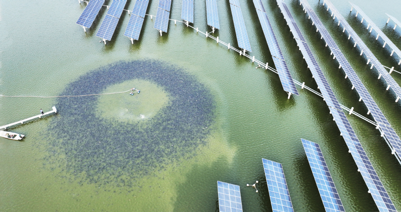 7月21日,俯瞰東辛農(nóng)場光伏塘口,水面上成群的魚爭食,呈現(xiàn)“上有光伏發(fā)電,下有魚蝦歡騰”的生態(tài)生產(chǎn)圖景。